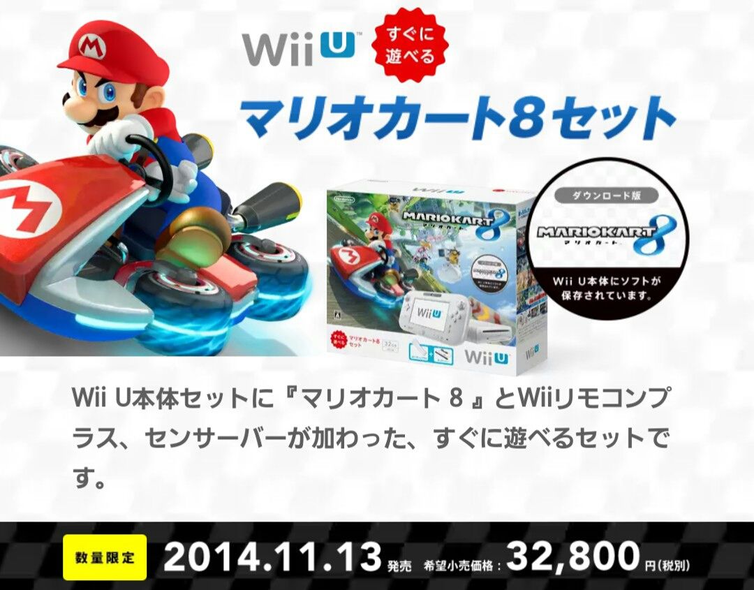 通常5000円ぐらいするマリオカート8が付いて、32800円(税別)となっています。もうマリカとか遅くね?って思った方も、全然遅くありませんよ!